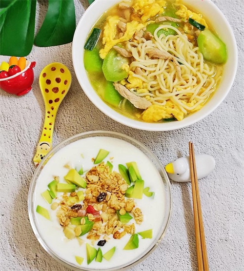 肉丝八棱瓜鸡蛋面+香蕉牛油果麦片酸奶