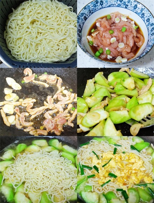 食材:肉丝、八棱瓜、鸡蛋、面条、大蒜、葱、老酒、生抽、盐、糖