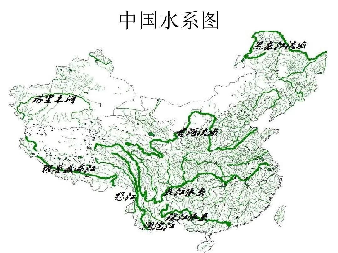 图23,中国水系图。塔里木河、雅鲁藏布江、怒江、澜沧江、珠江水系、长江水系、黄河水系、黑龙江水系分布图。