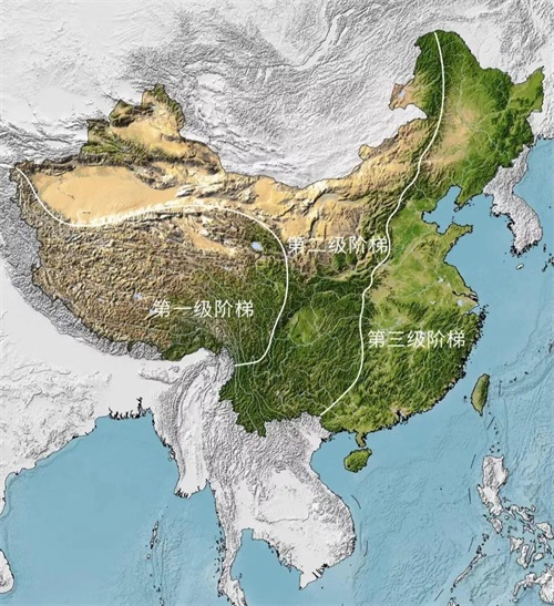 图15,中国地理研究所提供的地形图。可以很清晰分辨出第一阶梯(青藏高原)、第二阶梯(新疆地区、内蒙古高原、云贵高原、黄土高原)以及第三阶梯(长江中下游平原、华北平原、东北平原)的分界线。
