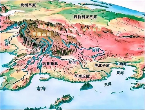 图18,东亚、北亚、东南亚、欧洲平原地势和主要水系彩绘图。思考一下青藏高原的重要性。
