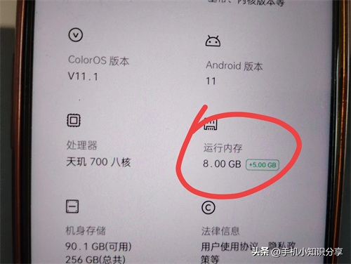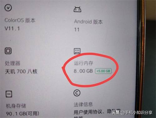 耐心等待一会,再次打开设置,点击“关于手机”,这时就能看到运行内存由 8g 变成了 8+5g,内存拓展成功。(如上图所示)