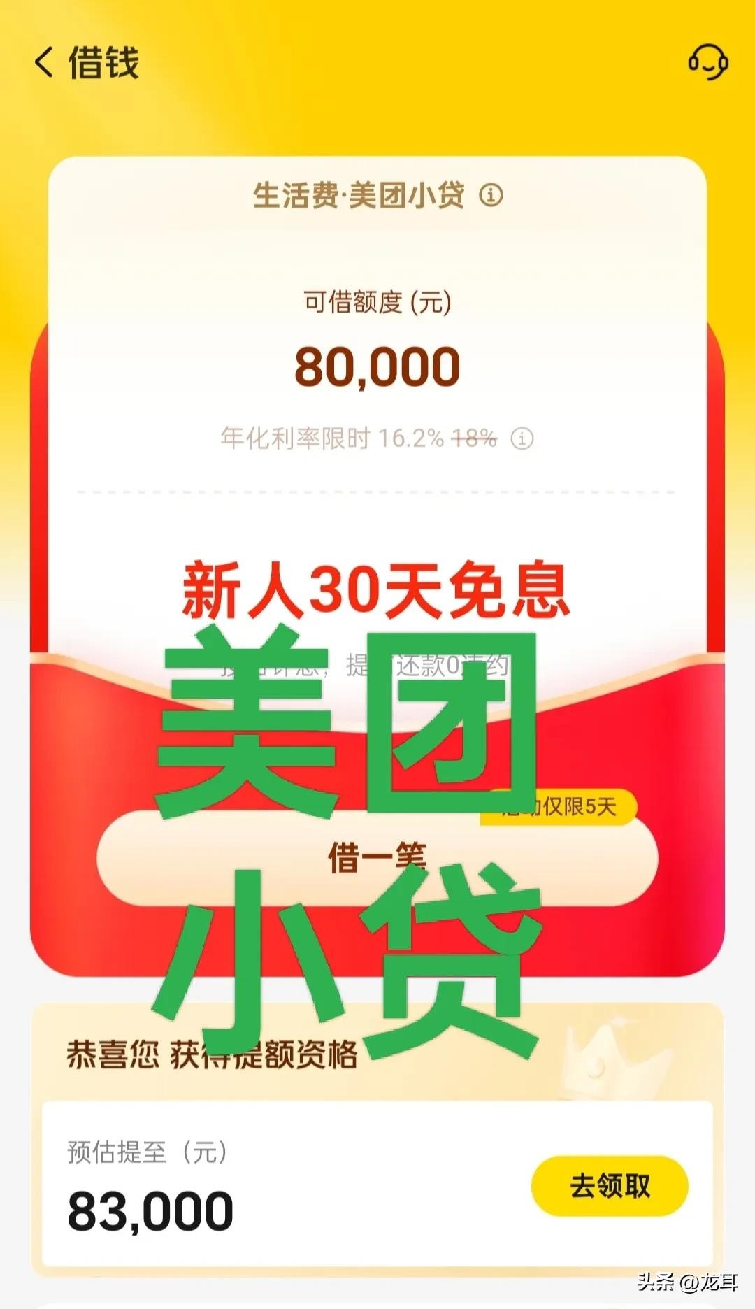 5.最后,来看看你天天点外卖的美团上面的美团小贷,这个利率也不低,限时是16.2%,正常呢就是18%。这为了吸引贷款,还给你新人30天免息呢。