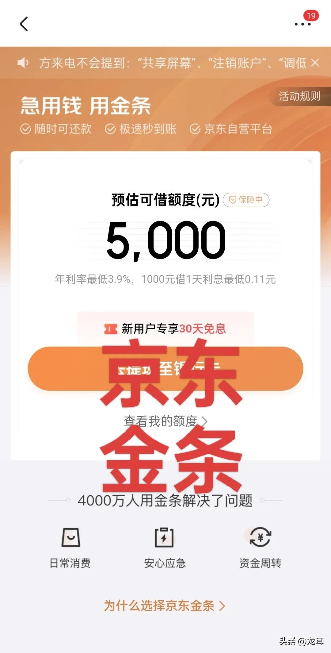 4.再来看刘强东主导的京东平台上的金条,年化利率最低为3.9%,这个看着低,实际用的话,可能很多人享受不到3.9%的利率,估计都是5%以上了。京东这个看着算这里面比较差不多的,为了吸引人,新用户还给了30天免息。