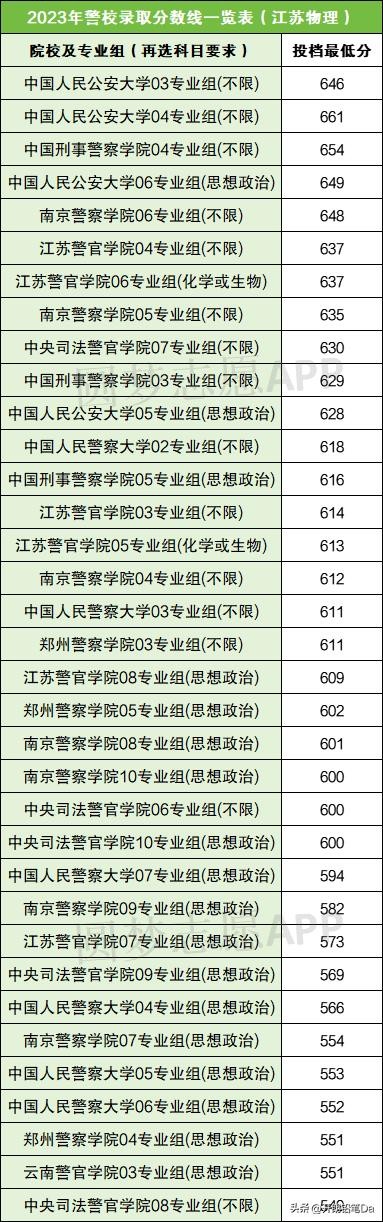 警校最高分是646,对应的是中国人民公安大学03组,此外在排名前十的专业组中,包含了5所学校,有刑警学院、司法警官学院、江苏警院。