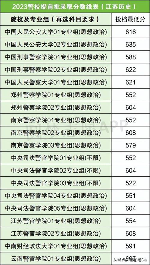 由于警校的公安类专业入警率很高,报考警校的同学一般都更偏向于选择公安类专业,因而小编在此整理的是警校2023年在江苏提前批的分数线,如下: