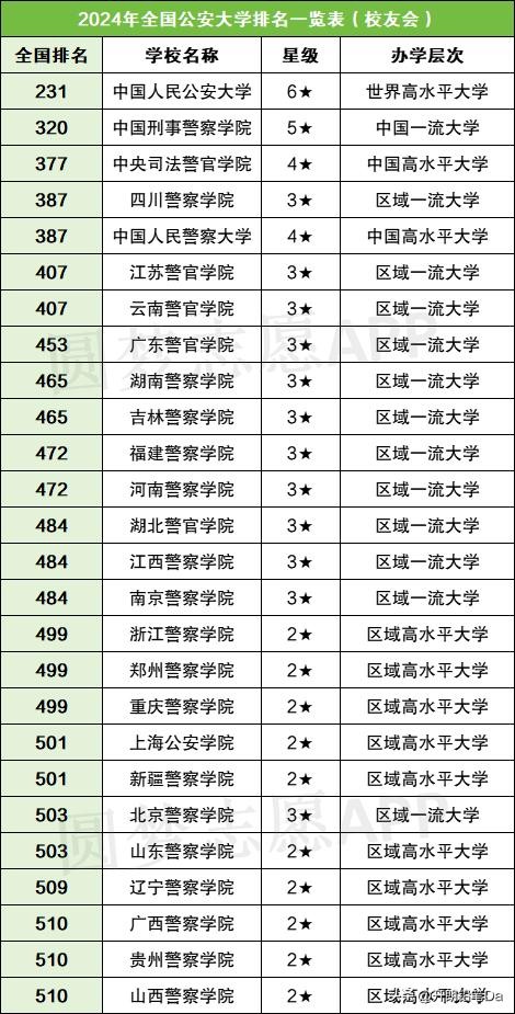 公安大学中排在第一的是中国人民公安大学,位于全国第231名;排名最靠后的是山西警察学院,位于全国第510名。
