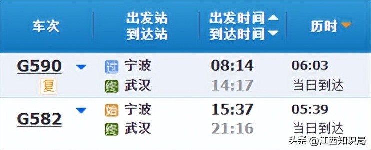 目前,宁波至武汉每天有2个车次的高铁,即G590次和G582次列车。