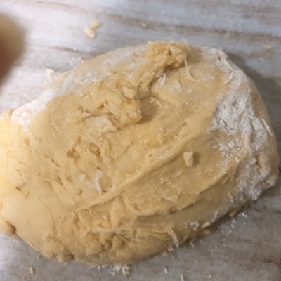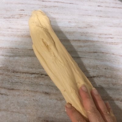 13、然后揉圆面团,按扁,用擀面杖擀开成牛舌状,卷起,放一旁备用,剩下的也都这样做,然后再从第一个拿起再按扁,擀成牛舌装,总共擀了三次