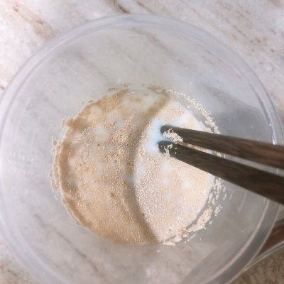 2、把牛奶温一下,可以微波炉叮十秒或者隔水温下,然后加入酵母,搅拌至酵母融化,放置一旁备用