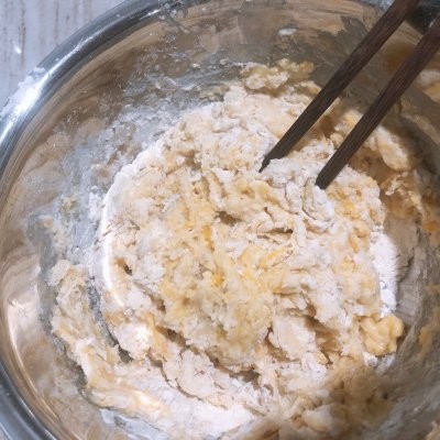 3、高筋面粉中在每个角落加入除黄油外,剩下的食材,先把鸡蛋搅散,然后再慢慢加入牛奶酵母水,边倒边用筷子搅拌成面絮,再下手柔成面团!⚠️放食材时,不要堆放一起,要放在每个角落,这个很重要!
