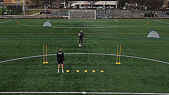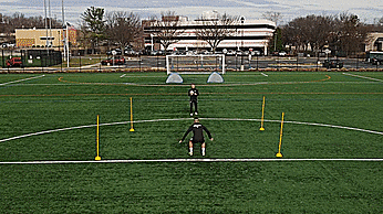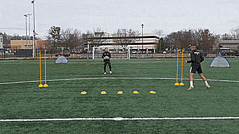 第一个练习是以一个协调的侧滑步练习开始,然后到假人的前接球,接着快速地把球传入前方的小网内。
