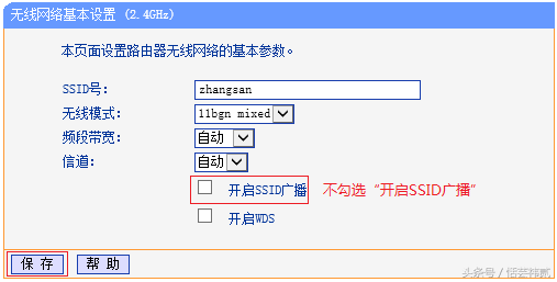 对于较老版本的路由器,登录路由器管理界面,点击 无线设置 > 基本设置,把 开启SSID广播 前面的勾去掉,保存并重启路由器就行。