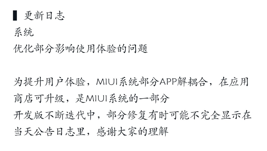 官方更新日志为“系统:优化部分影响使用体验的问题”。
