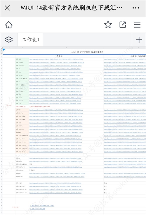MIUI 14 具体最新支持机型如下载文档所示,包括公测和内测更新线,由于其中机型名单来自极客君纯手工统计,如有遗漏欢迎大家补充。