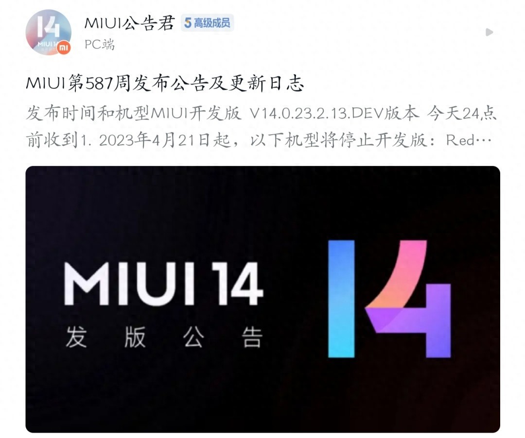 本周,小米 MIUI 开发版迎来了最新的第 587 周更新,目前最新的 MIUI 14 开发版系统版本号是 V14.0.23.2.13.DEV,本次更新无新增支持机型。