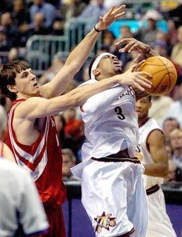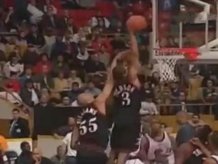 艾弗森整个生涯,有记录的扣篮也就40次,这让很多人误以为他弹跳差。艾弗森弹跳真不差,他的弹跳绝对是NBA最高一档。别的不说,就拿骑扣坎比这一球来看,艾弗森手臂超框明显,就他这弹跳至少在1米1以上,他一样是属于“弹簧人”级别。