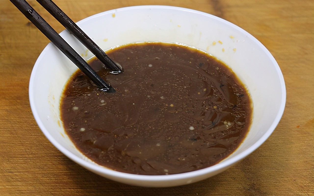 第四步:调汁。准备一个大碗,加入少许盐入底味。再加入鸡精(不喜欢的可以不放)、生抽酱油、陈醋、白糖、料酒、芝麻香油、蚝油(也可以不加)调味,然后继续往碗中加入少许清水和干淀粉,用筷子搅拌均匀备用。