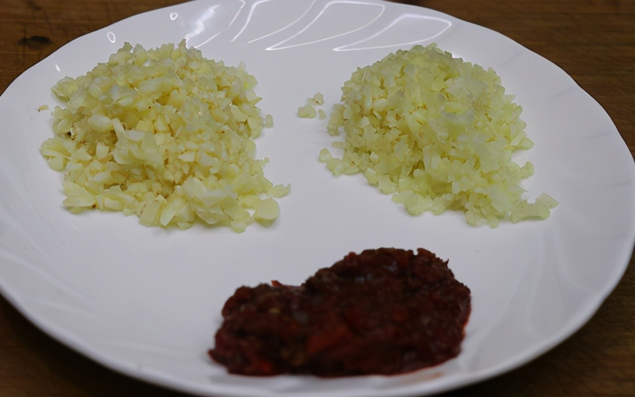 第三步:黑木耳泡发并清洗干净,改刀切成丝;冬笋切片再改刀切成丝;大蒜、生姜切成末(大蒜比生姜多一些);泡灯笼椒去掉籽然后剁碎再加入少许豆瓣酱充分剁碎,剁细腻。
