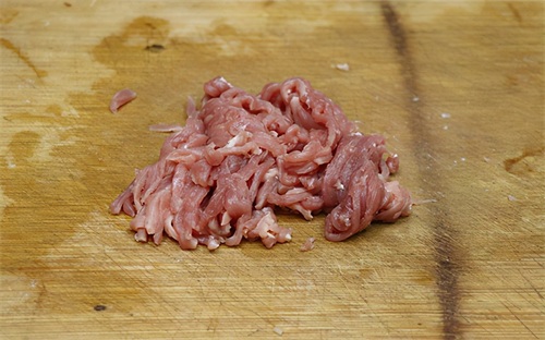 第六步:把锅先充分烧热,然后加入一勺油,晃动锅子,让锅的四壁都淋上油,油热之后倒出去,再加入一点冷油,重复这一步骤2-3次。再次往锅中加入冷油,然后把腌制好的肉丝下入锅中,用勺子快速滑散,炒至肉丝变白,然后倒出来备用。