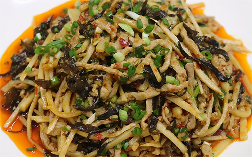 第七步:把锅烧热加入少许的油,下入姜蒜末,煸炒出香味后下入泡椒末和豆瓣酱,炒香后下入肉丝、笋丝和木耳,继续煸炒出香味后,倒入调好的料汁,大火翻炒均匀后,撒入葱花,再淋入少许明油,翻炒均匀即可出锅。