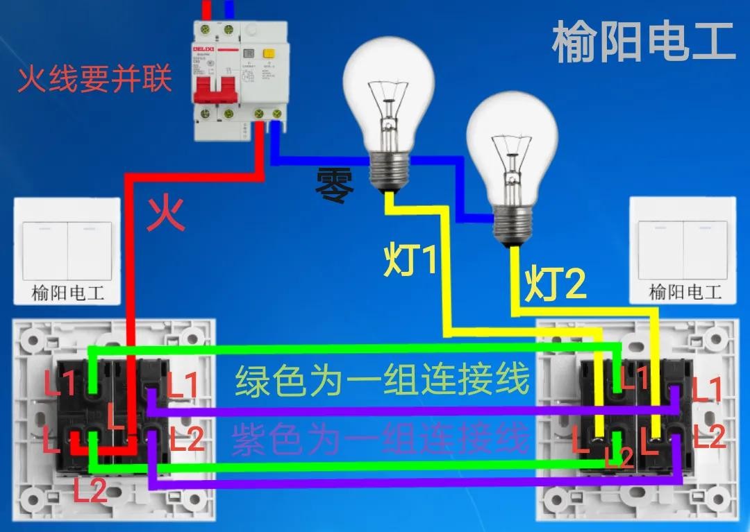两根紫色为一组双控连接线,分别接两个开关的L1和L2