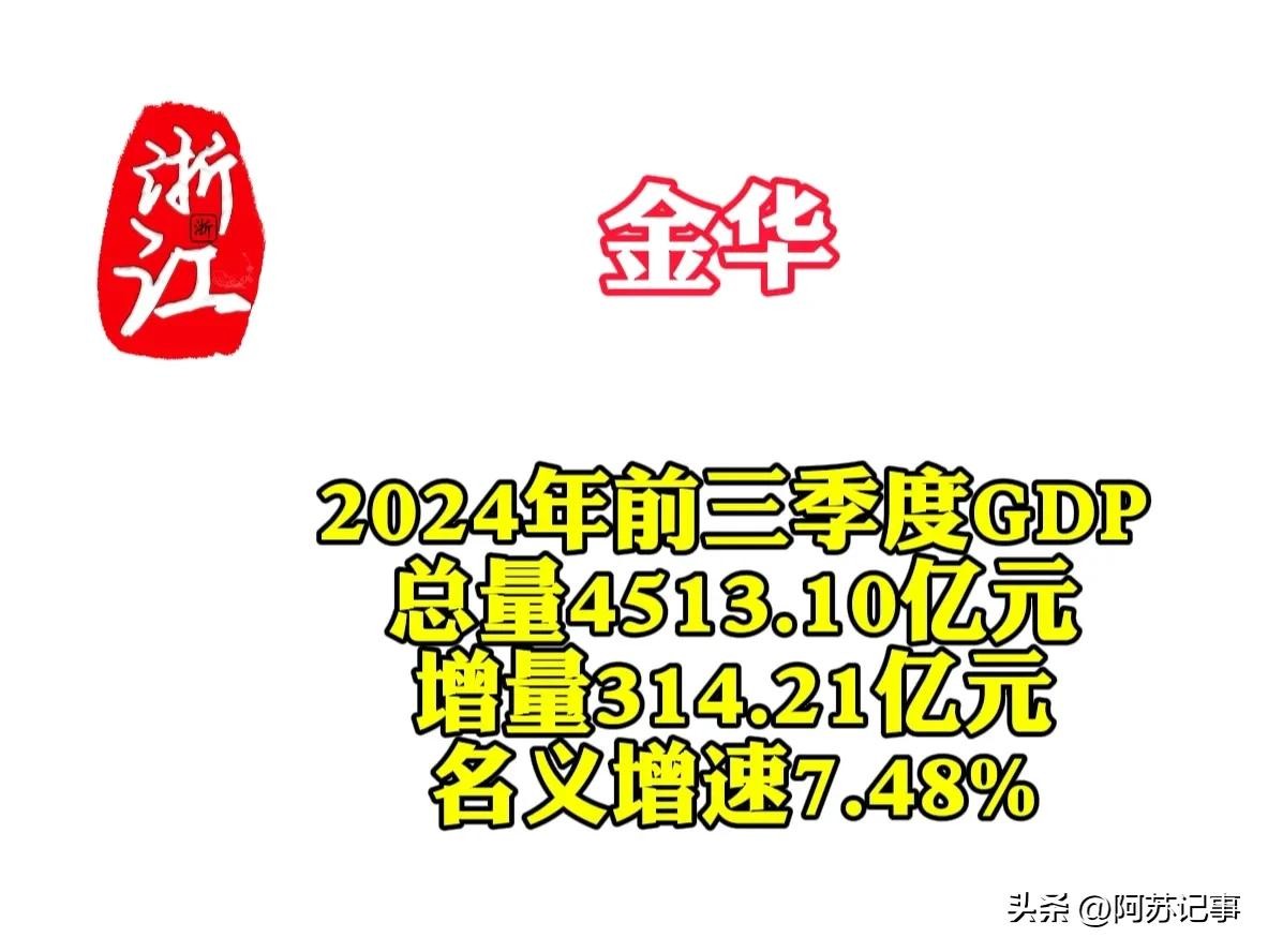金华2024年前三季度GDP总量为4513.10亿元,增量314.21亿元,名义增速7.48%。