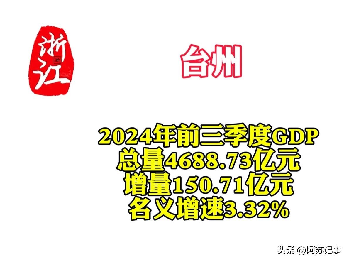 台州2024年前三季度GDP总量为4688.73亿元,增量150.71亿元,名义增速3.32%。