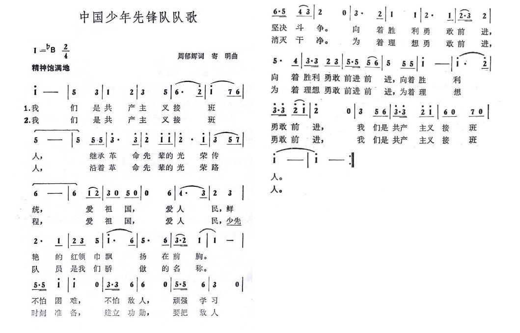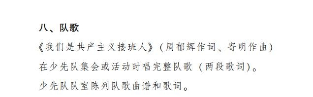 1949年第一版队章(草案)规定的《中国少年儿童队队歌》郭沫若词、马思聪曲,“我们新中国的儿童,我们新少年的先锋,团结起来,继承着我们的父兄,不怕艰难,不怕担子重,为了新中国的建设而奋斗,学习伟大的领袖毛泽东......”,1954年名称改为《中国少年先锋队队歌》。