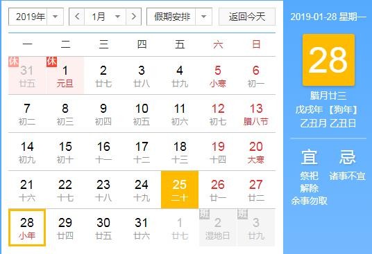 2019年的小年时间在1月28日,农历的12月23日。