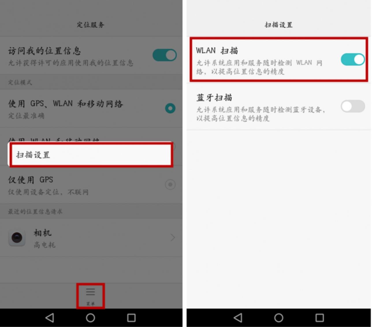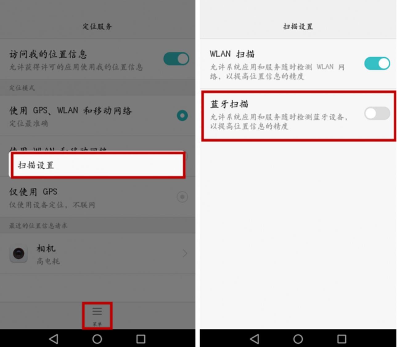同样是进入设置—高级设置—定位服务—菜单—扫描设置—然后将“蓝牙扫描”开启;