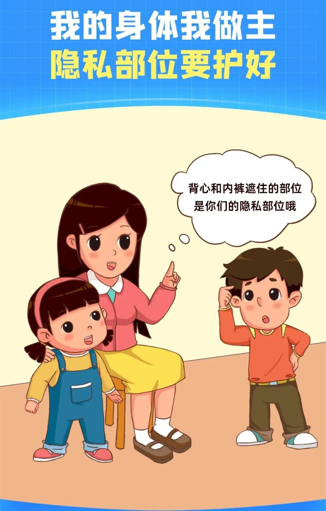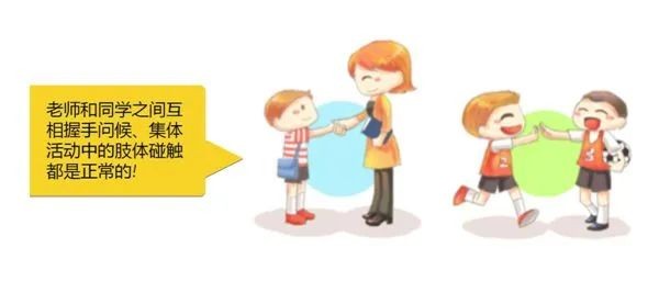 家长要告诉孩子:“背心、短裤遮盖的地方是隐私部位,不可以随便给人看,也不可以随便给人摸。如果有人摸了你的隐私部位,你可以勇敢拒绝,并回来告诉家长。”