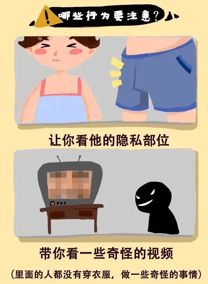 而让你裸露身体或者看带有身体裸露的人像图片、影像视频,同样也属于性侵害。坏人是没有特征的!陌生人不一定是坏人!坏人不一定是陌生人!