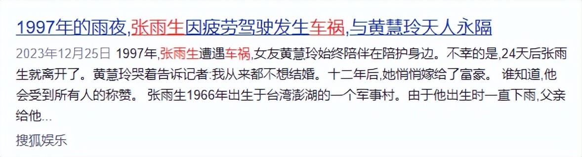 资料参考:2023-12-25搜狐娱乐——1997年的雨夜,张雨生因疲劳驾驶发生车祸,与黄慧玲天人永隔
