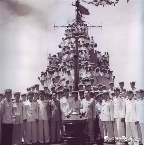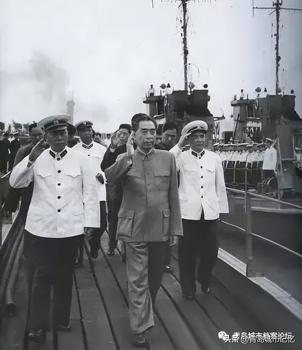 海上阅兵结束后,周恩来在“鞍山”舰与官兵合影