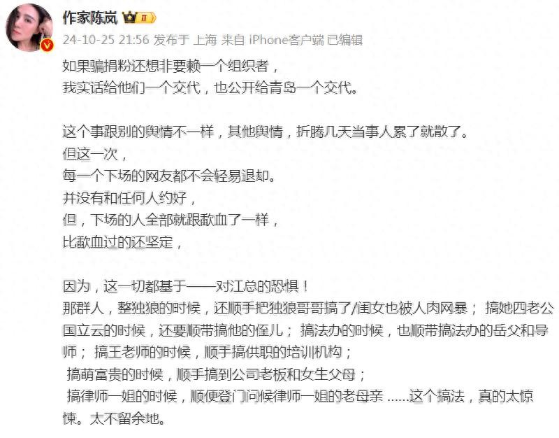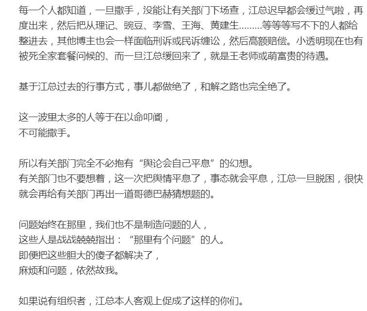 陈岚还说,虽然这件事没有正式的组织者,但“江总”的行为实际上促使了这些人团结在一起。大家希望有关部门能够认识到这一点,不要指望舆论会自然平息,而是要采取行动解决问题。