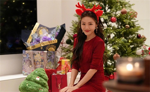 一身红色装扮整个人显得喜庆无比,头戴红色发饰,状态太好了!