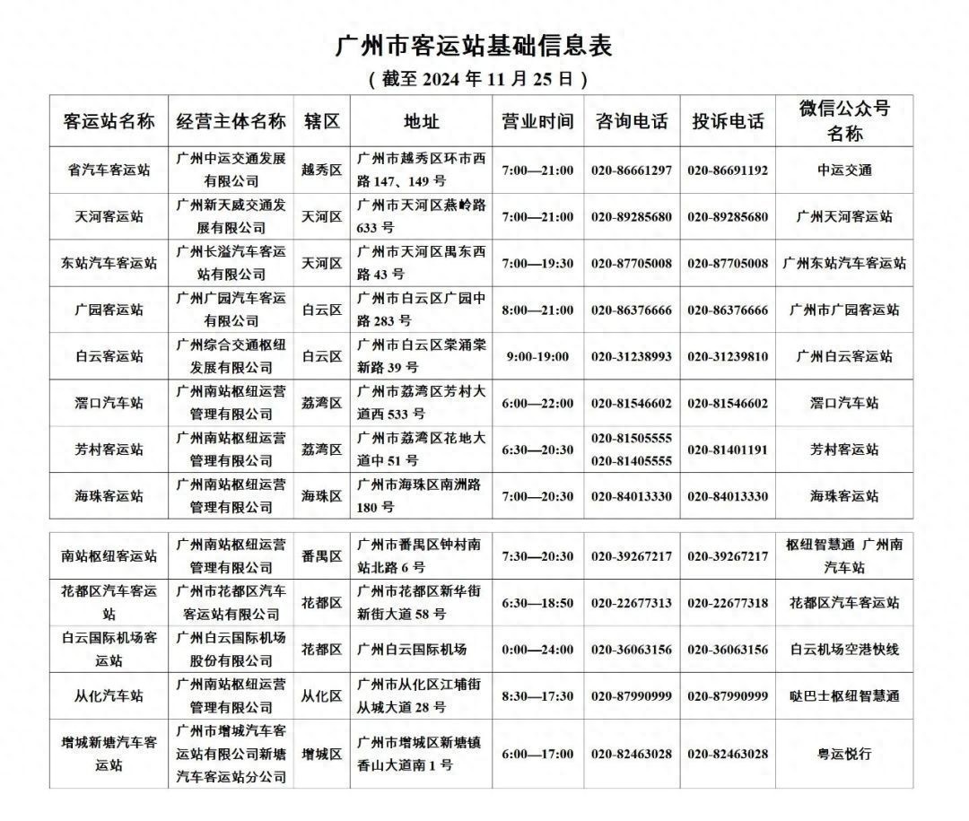近日,记者了解到,为更好满足市民获取客运站咨询电话、地址、购票、退改签等信息的需求,结合白云客运站新开通运营及其他站场调整情况,市交通运输部门重新整理了客运站的基础信息,并督促客运站持续提升服务水平,保障市民群众平安便捷出行。