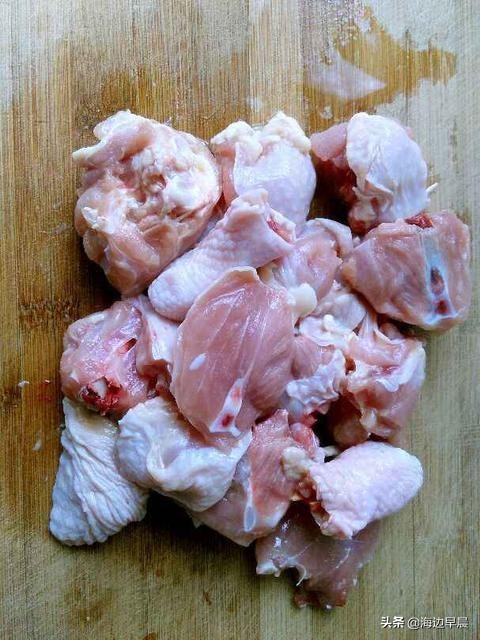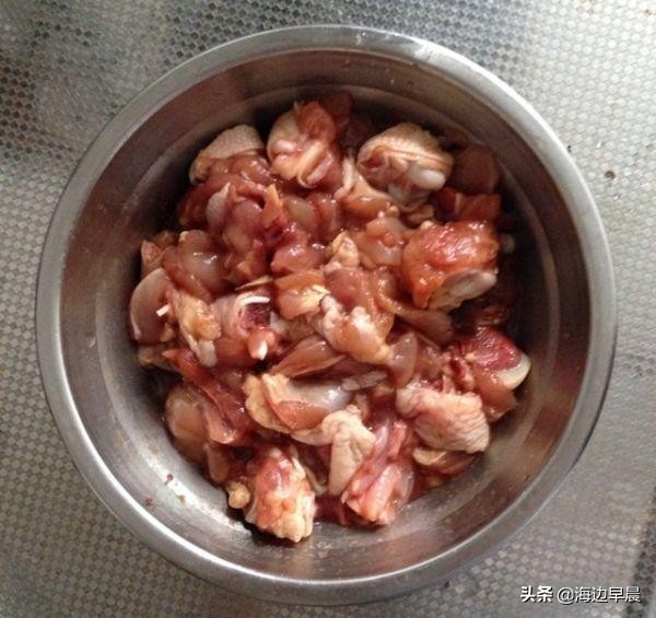 1、鸡肉加工:将鸡腿肉切成小方块,洗净以后沥干水分。