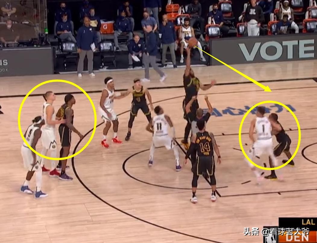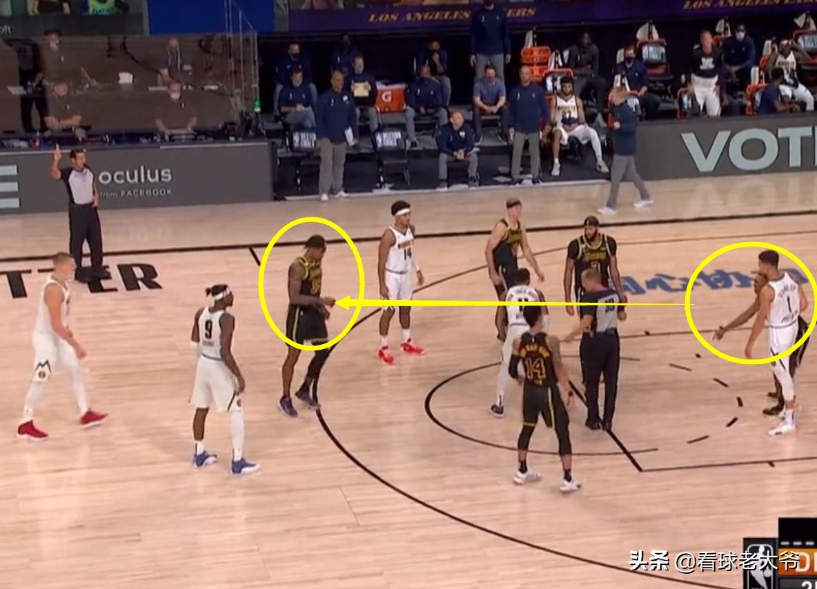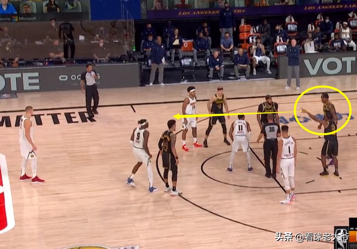 这场比赛中,浓眉哥和对方的莫里斯,有一次跳球的机会,当时双方的球员都在罚球线附近站定了,这时候隆多突然发现,浓眉哥的这一侧站着有4名的湖人球员,掘金没有1个人,这显然有些不正常。隆多也是赶紧拉住霍华德,指挥着让他别在这了,赶紧去弧顶的位置站着,因为他很有可能是约基奇要一会移动过来的位置。