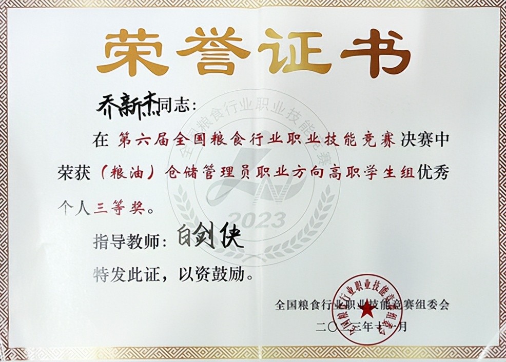 11月13日至15日,第六届全国粮食行业职业技能竞赛决赛在广西南宁举行,来自全国30个省份34支代表队、322名选手参加了决赛。河南工业贸易职业学院副校长刘卫红亲自带队,职业技能鉴定中心主任李玉红等人随行。经过两天的激烈角逐,由河南工业贸易职业学院粮食工程学院白剑侠老师指导的学生乔新杰斩获(粮油)仓储管理员职业高职学生组三等奖,实现学校该类奖项零突破。