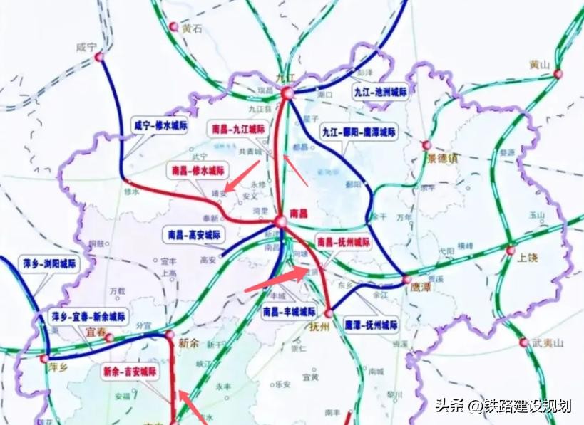 九江至鄱阳至鹰潭城际铁路:目前,处于规划阶段,建成通车后,将大大缩短九江至鹰潭的旅行时间,完善鄱阳湖区铁路网,同时也将打造上饶西部,即鄱阳十字铁路枢纽。目前,九江至鹰潭最快列车——G2035次列车,耗时1小时33分钟。