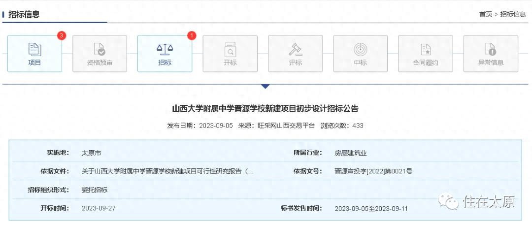 公告显示:本招标项目山西大学附属中学晋源学校新建项目初步设计己由太原市晋源区行政审批服务管理局批准建设,招标人为太原市晋源区教育局,资金来源为晋源区财政,本项目己具备招标条件,现进行公开招标。