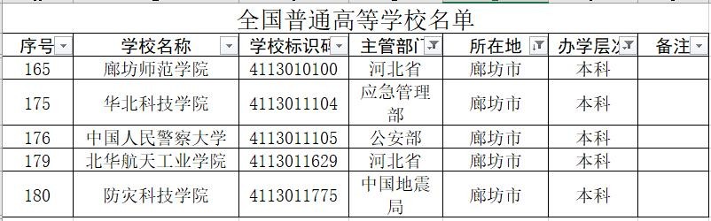 (7)廊坊的本科学校(5所):廊坊的公办本科学校比较多,达到了5所,分别是廊坊师范学院,华北科技学院,中国人民警察大学,北华航天工业学院和防灾科技学院。