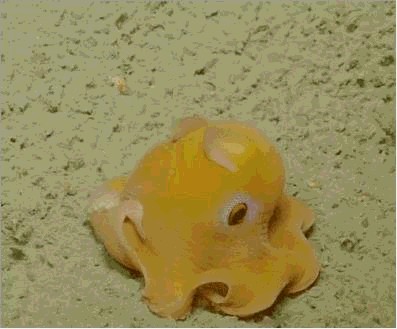 今天给大家介绍一个小可爱——“烟灰蛸”,看到这个名字你应该联想不到它的模样,它是一种可爱模样的特殊章鱼,有着“深海小飞象”的称号,它长得也像一个小象,外形上像一个大大的果冻,长着两个小耳朵(为什么章鱼会长小耳朵),皮肤光滑,肌肉松软,前方的外套腔形状像小象的鼻子一般,所以被称为“深海小飞象”。
