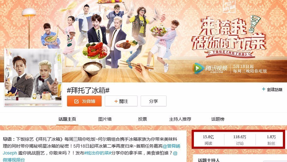 最强的逗比阵容:“极品MC+搞笑厨师+虐狗嘉宾+逆天后期”让《拜托了冰箱》累计至今线上播放量已飙超5.5亿。新浪微博话题阅读量破15.8亿,参与互动人数飚超118万,节目播出后秒速涨粉过18W人。每一期节目都是密密麻麻的弹幕,充满着“冰箱贴”们对冰箱家族的厚爱,就连有毒的后期制作也有粉丝留言想要给TA们生猴子。评论多到喷井,看不清视频。《拜托了冰箱》火不火这就是最好的证明!