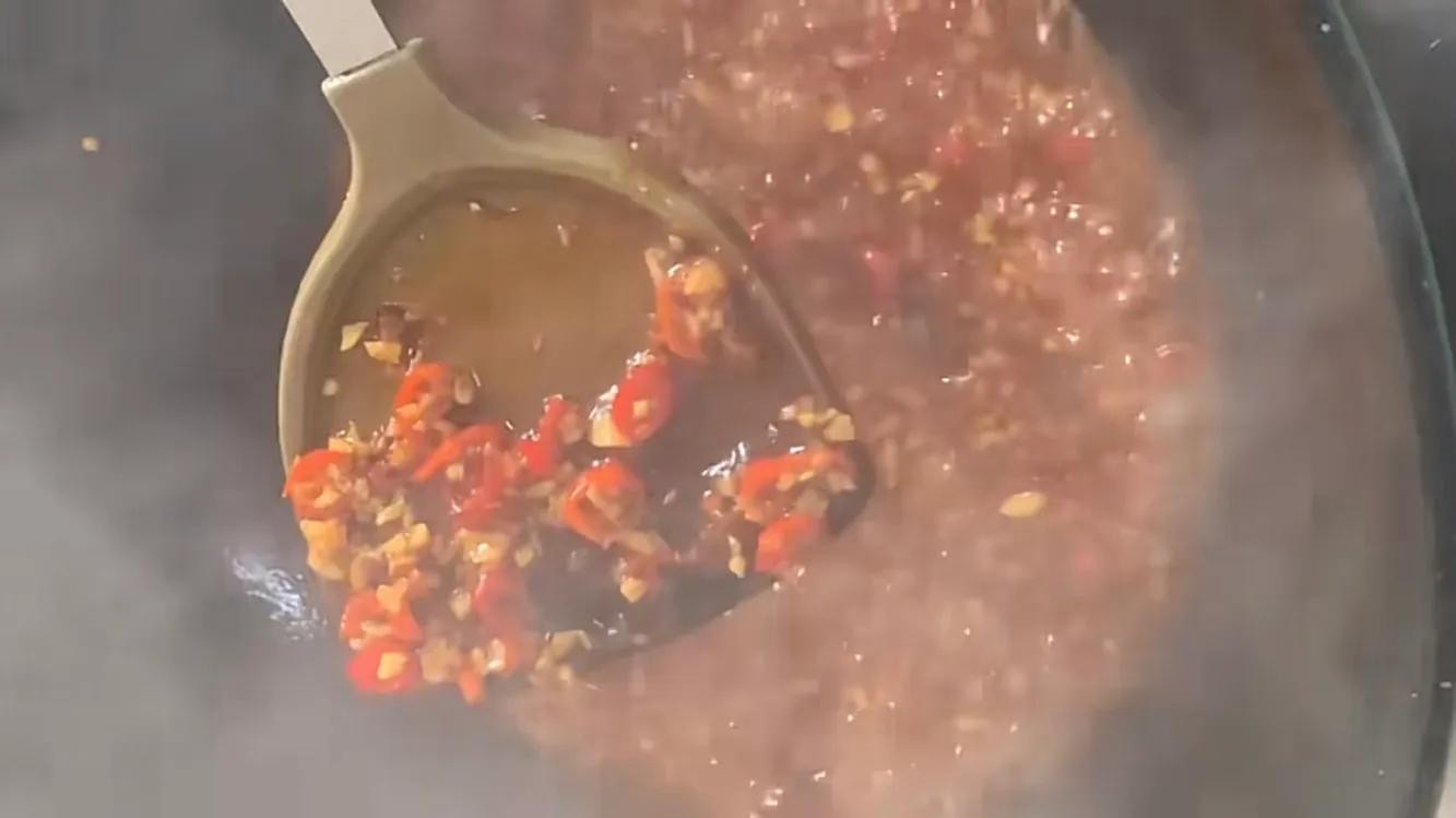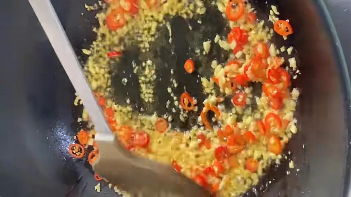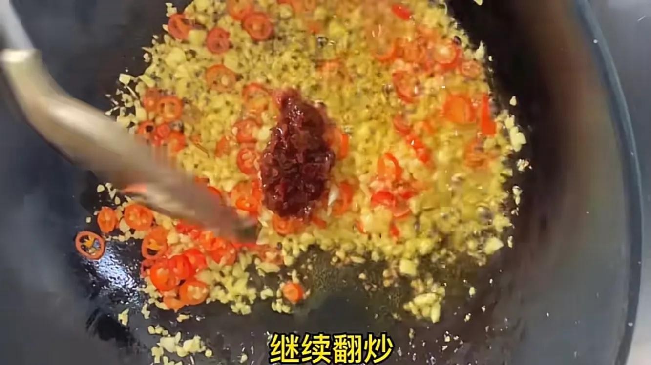起锅,锅热后加入适量的食用油,油热后把准备好的蒜末和小米椒加进来翻炒,开小火翻炒,炒出香味,把用小火把蒜末炒至微微发黄,炒成这样就可以了。