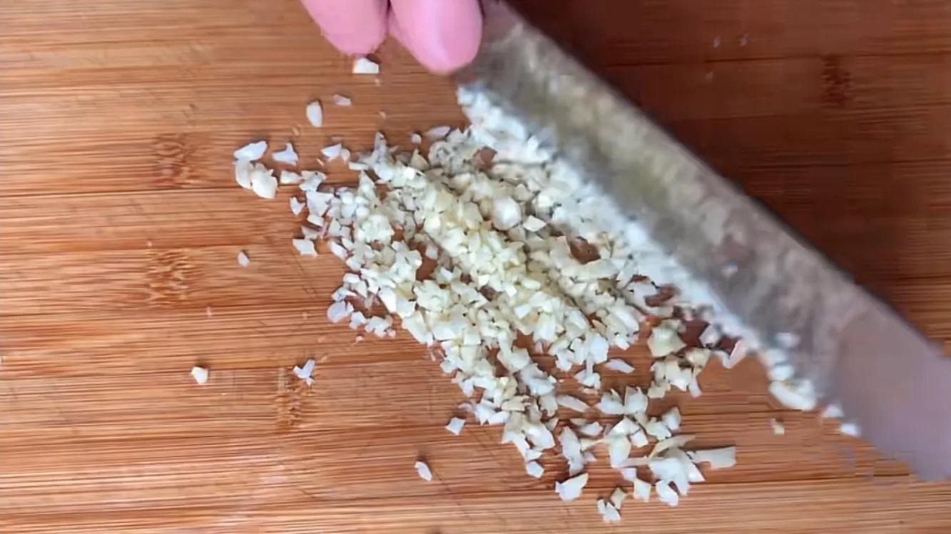 准备一把大蒜,这道菜的大蒜要多准备一些,先用刀拍一下,拍过的大蒜容易出味,然后剁成蒜末,蒜末也要剁的碎一些,剁好后装入碗中。