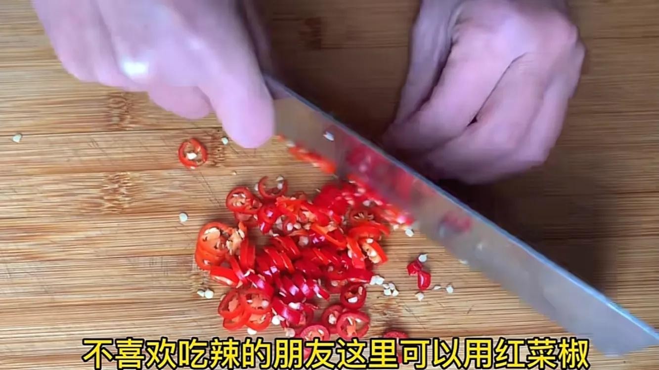 再准备几个小米椒,喜欢吃辣的朋友可以多放几个,把它切成小米椒圈,不喜欢吃辣的朋友这里可以用红菜椒或者不放,切好后装入蒜末一起备用。