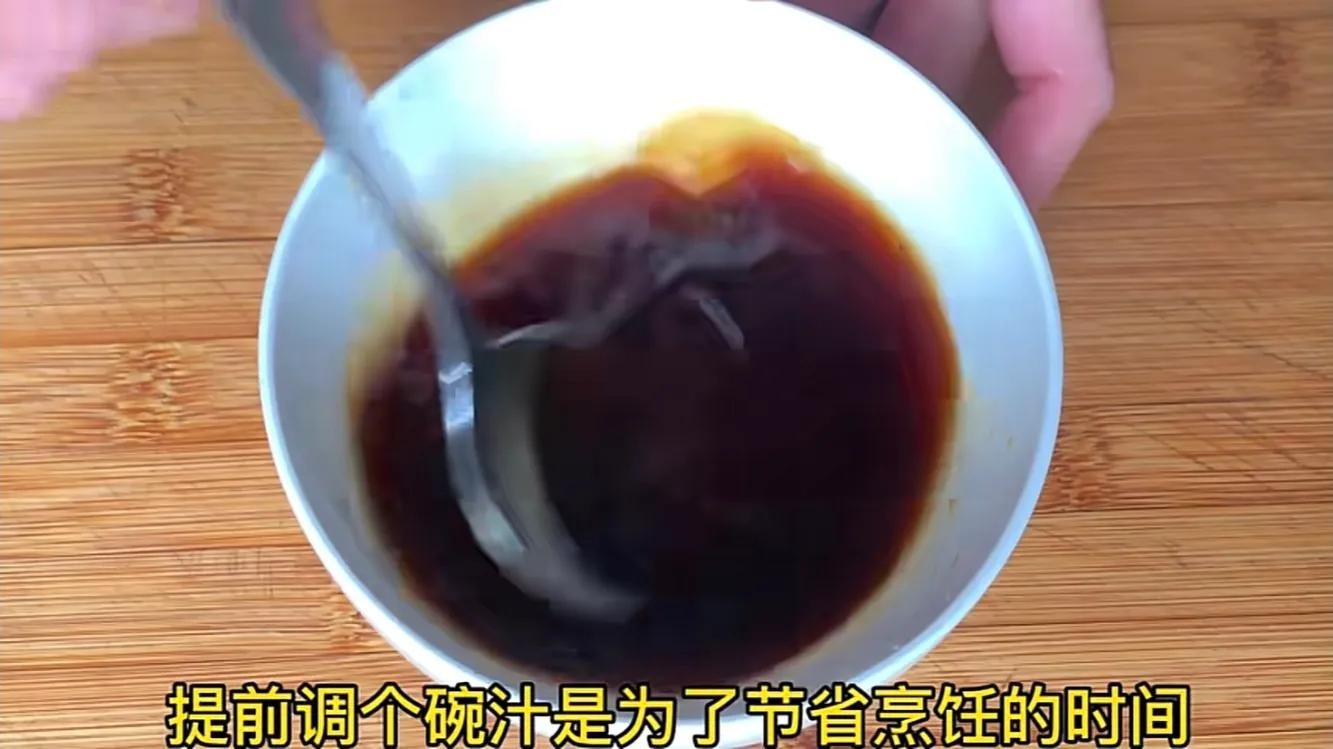 接着我们再来调个碗汁,小碗中加入2勺生抽,一勺胗鱼豉油,没有的可以不放,再加入少许鸡精,小半勺白糖提鲜,加入小半碗清水,用勺子搅拌一下,搅拌均匀,提前调个碗汁是为了节省烹饪时间,也不会手忙脚乱的了。搅拌至白糖融化后放一旁备用。